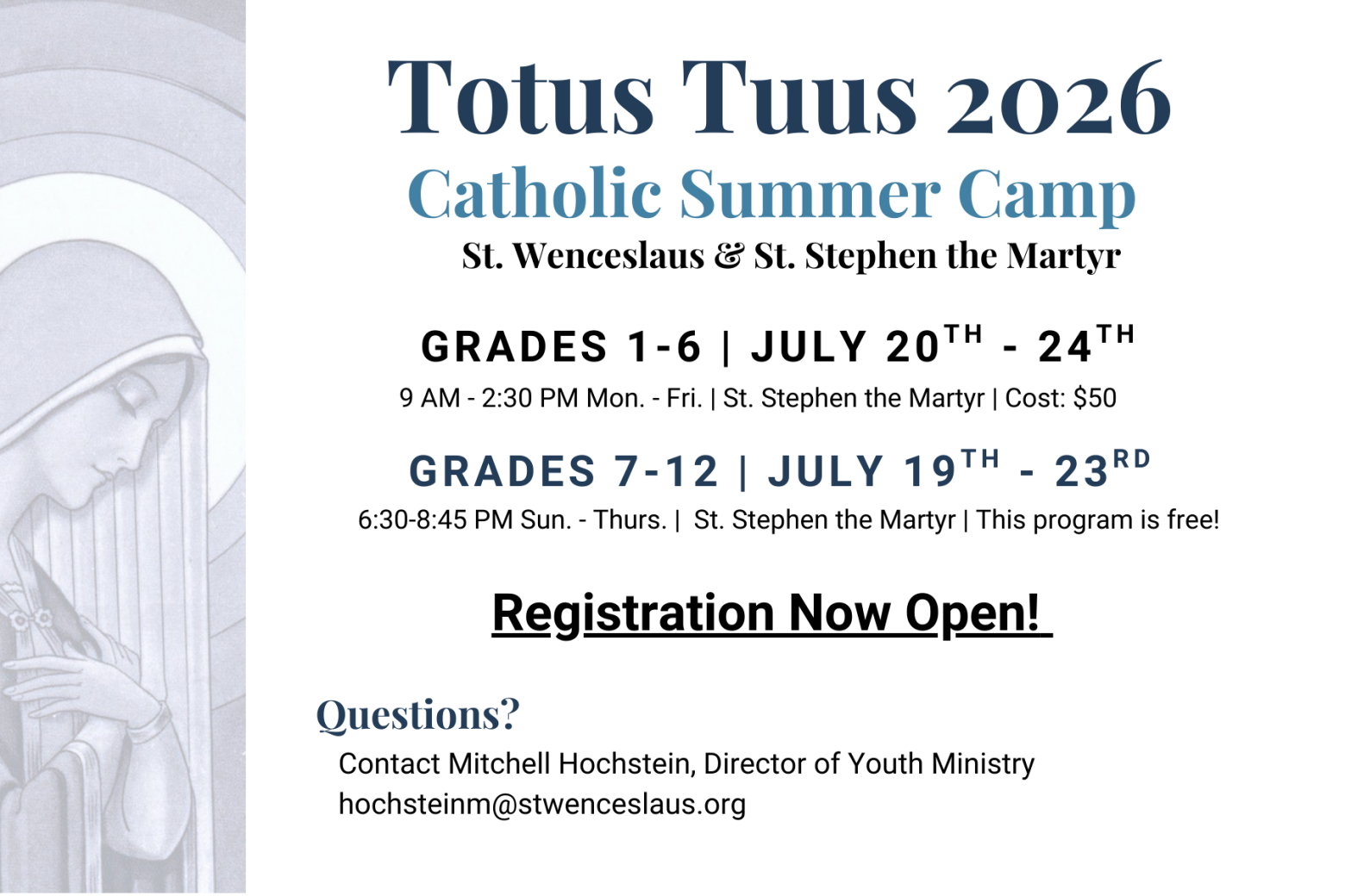 - Parish Updates: Lent Activities, Totus Tuus Registration, Register for Steubenville, Vacation Bible School, New Confirmation Coordinator, Middle School Youth Ministry Volunteers Needed